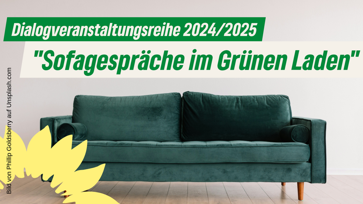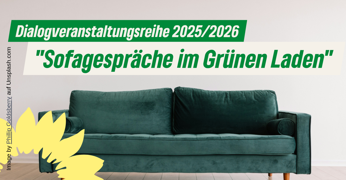 Der Kreisverband Bündnis 90/Die Grünen startet ab Herbst 2024 eine Dialogveranstaltungsreihe. Die unter der Überschrift „Sofagespräche im Grünen Laden" geplante Reihe wird alle zwei Monate am dritten Dienstagabend jeden ungeraden Monat` stattfinden und sich mit gesellschaftspolitisch relevanten Themen beschäftigen. Die Relevanz für unsere Region ist uns dabei sehr wichtig! Basierend auf Impulsvorträgen von Expertinnen und Experten wollen wir ins Gespräch kommen und lösungsorientierte Antworten für sachpolitische Herausforderungen unserer Zeit gemeinsam erörtern. Gern auch mal kontrovers! Jede interessierte Bürgerin und jeder interessierter Bürger ist zu den Sofagesprächen herzlich willkommen!