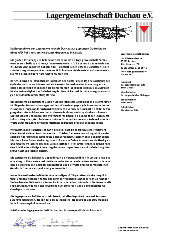 "Mit großer Bestürzung und tiefem Unverständnis hat die Lagergemeinschaft Dachau von der Entscheidung erfahren, einem Vertreter der AfD die zentrale Gedenkrede am 27. Januar 2025 in Coswig anlässlich des Holocaust-Gedenktages zu überlassen. Diese Entscheidung widerspricht aus unserer Sicht fundamental dem Geist und den Werten, die mit diesem Tag der Erinnerung verbunden sind", zitiert der Kreisvorstand die Stellungnahme der Lagergemeinschaft Dachau.