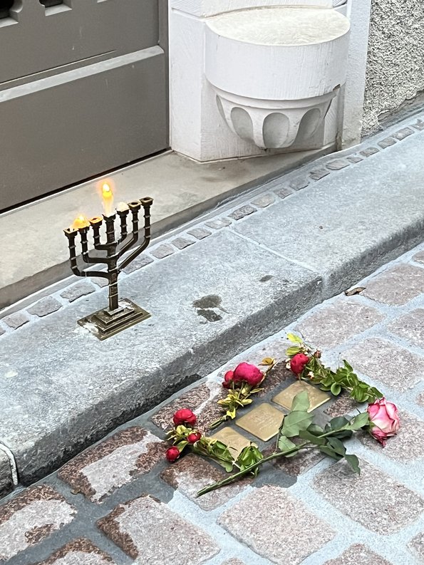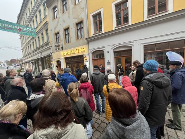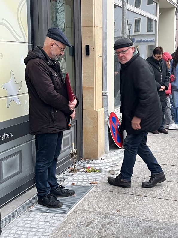 Meißen, 10. November 2025. Rund 50 Menschen folgten am 9. November dem Aufruf der Bürgerinitiative Stolpersteine Meißen e.V. und des Bündnisses für Zivilcourage – Buntes Meißen e.V., um an die Opfer des Novemberpogroms 1938 zu erinnern. Die von Bernd Oehler, Vorsitzender der Initiative, organisierte Gedenkveranstaltung führte die Teilnehmer*innen auf den Spuren der einstigen jüdischen Gemeinde Meißens durch die Altstadt. An den in der Elbstraße, Neugasse und Görnischen Gasse verlegten Stolpersteinen wurden die Schicksale der über 80 vertriebenen jüdischen Mitbürger*innen gewürdigt – verbunden mit einer kritischen Reflexion über aktuelle gesellschaftliche Entwicklungen.